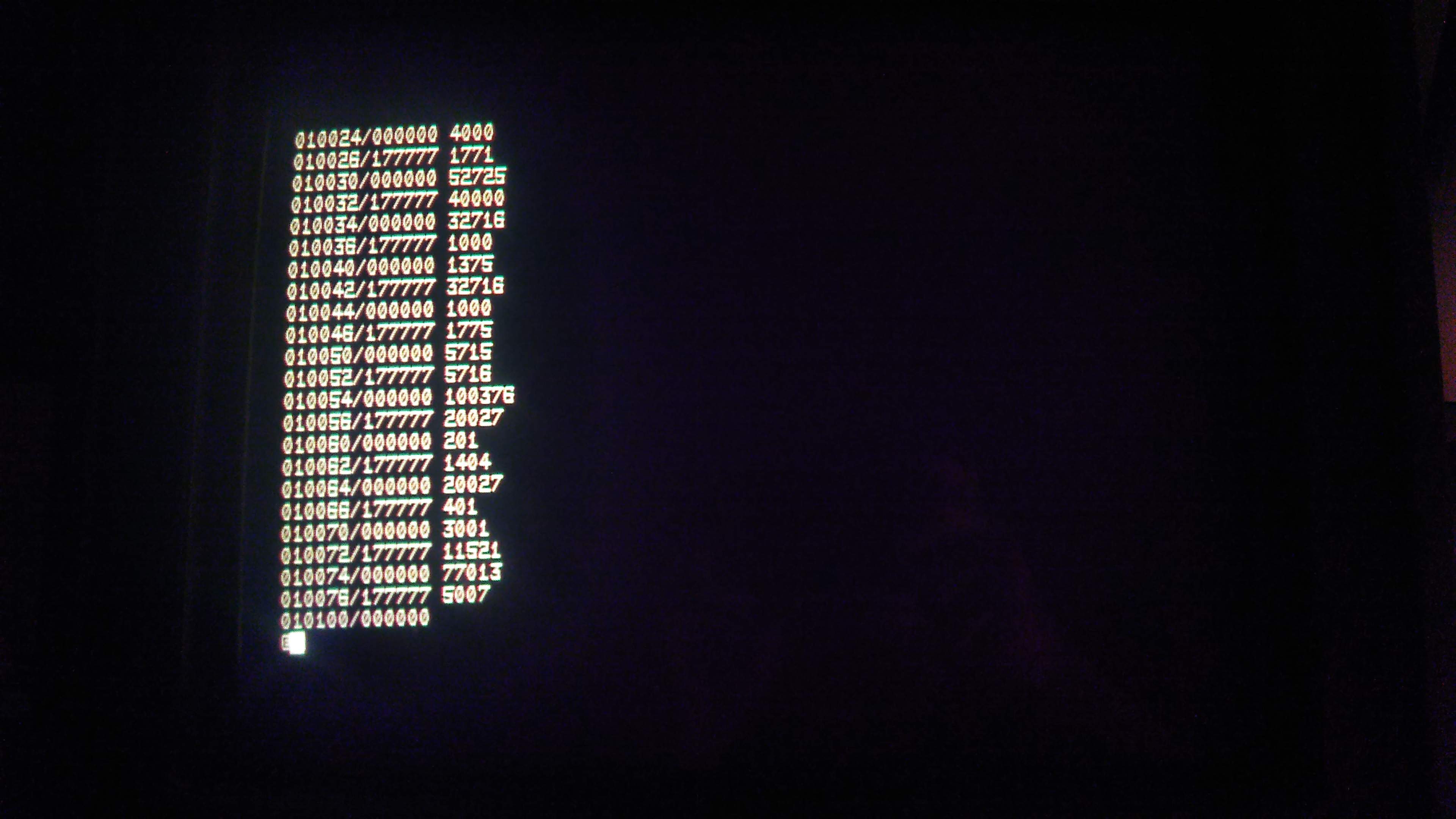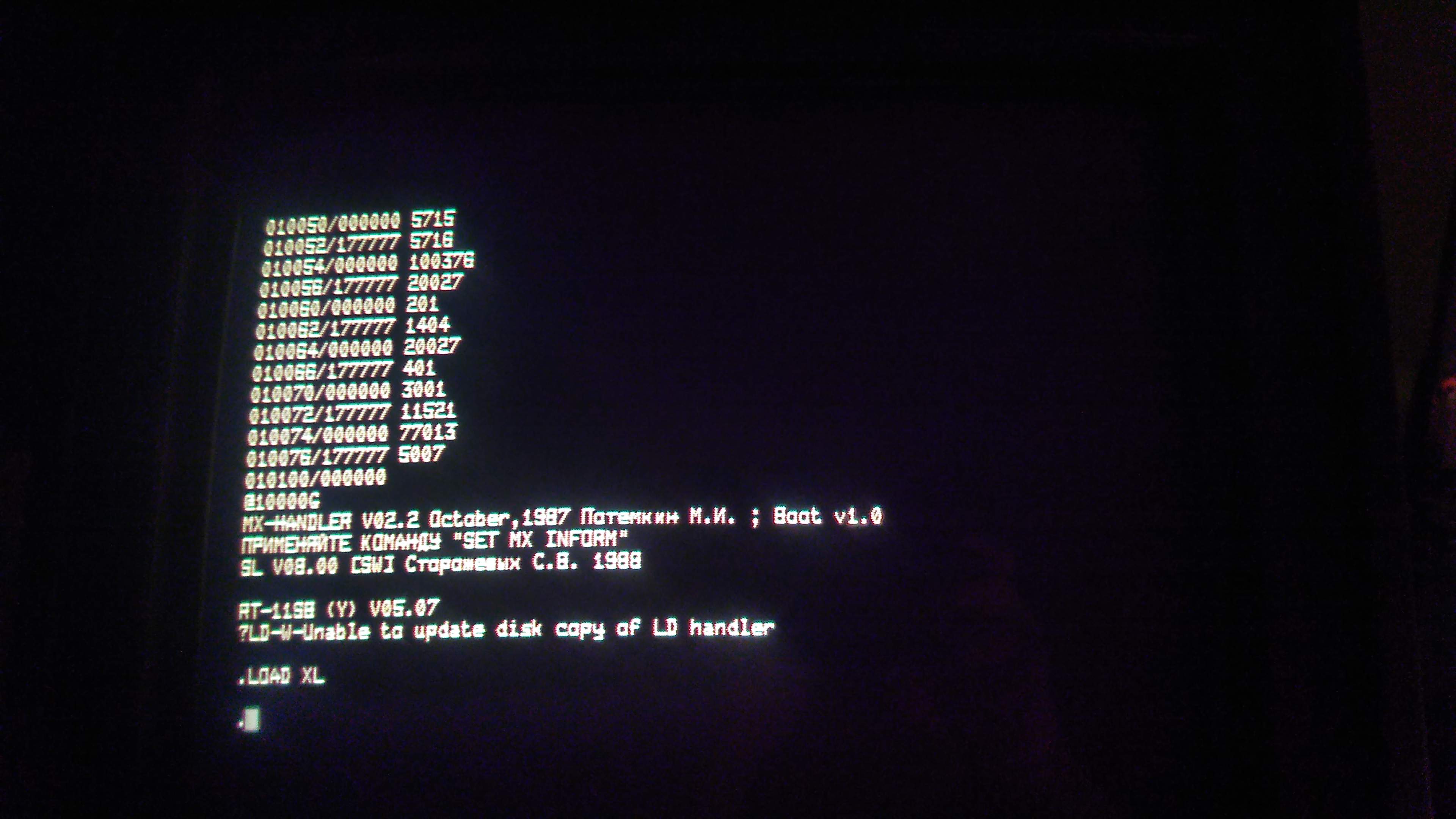 В архиве дампы двух микросхем в том виде, как они прошивались. Т.к. МПИ шина инверсная, то для приведения в читабельный вид данные и адреса нужно инвертировать. Вводить можно с любого адреса, начиная с 1000(8). Но контроля ошибок чтения нет, и если дискета читается плохо, то с первого раза загрузка может не произойти. Поэтому лучше выбрать старшие адреса, например 100000(8). Будет меньше шансов что код испортится и можно будет запустить его еще раз. MXBOOT MACRO V05.06R Monday 29-Oct-18 21:24 Page 1 1 .TITLE MXBOOT 2 3 000000 012706 177130 BOOT: MOV #177130,SP 4 000004 010605 MOV SP,R5 5 000006 012700 000403 MOV #403,R0 6 000012 012716 000320 2$: MOV #320,@SP 7 000016 005001 CLR R1 8 000020 077101 4$: SOB R1,4$ 9 000022 032716 004000 BIT #4000,@SP 10 000026 001771 BEQ 2$ 11 000030 052725 040000 BIS #40000,(R5)+ 12 000034 032716 001000 6$: BIT #1000,@SP 13 000040 001375 BNE 6$ 14 000042 032716 001000 8$: BIT #1000,@SP 15 000046 001775 BEQ 8$ 16 000050 005715 10$: TST @R5 17 000052 005716 12$: TST @SP 18 000054 100376 BPL 12$ 19 000056 020027 000201 CMP R0,#201 20 000062 001404 BEQ 14$ 21 000064 020027 000401 CMP R0,#401 22 000070 003001 BGT 14$ 23 000072 011521 MOV @R5,(R1)+ 24 000074 077013 14$: SOB R0,10$ 25 000076 005007 CLR PC 26 27 000000' .END BOOT MXBOOT MACRO V05.06R Monday 29-Oct-18 21:24 Page 1-1 Symbol table BOOT 000000R . ABS. 000000 000 (RW,I,GBL,ABS,OVR) 000100 001 (RW,I,LCL,REL,CON) Errors detected: 0 *** Assembler statistics Work file reads: 0 Work file writes: 0 Size of work file: 28 Words ( 1 Pages) Size of core pool: 16640 Words ( 65 Pages) Operating system: RT-11 Elapsed time: 00:00:00.00 DK:MXBOOT,DK:MXBOOT.LST=DK:MXBOOT Исходный и исполняемый код в архиве тоже есть, надеюсь без ошибок... Перед запуском нужно отключить таймер !!! А после загрузки системы можно включить его снова. Проверил на эмуляторе - вроде работает. Если есть интерес, можете проверить на живой машине